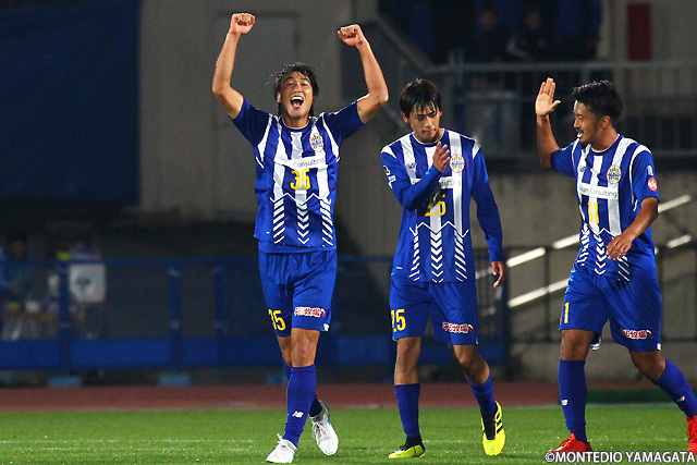 8分間という長いロスタイムの中、川崎フロンターレも最後の最後まで諦めずにゴールを目指して戦います。コーナーキックではゴールキーパーまで最前線に上げますが、ここもモンテディオ山形の選手全員が高い集中力をもってゴールを与えずタイムアップ。3-2のスコアで4年ぶりのベスト4進出を決めました。
