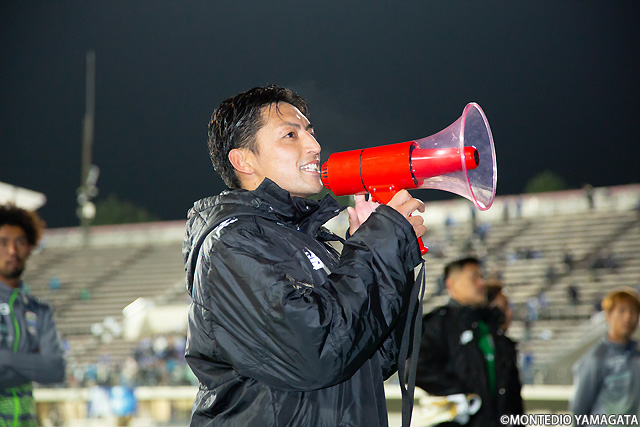 試合後、90分間声援を送り続けてくれたサポーターに感謝の言葉を掛けるキャプテン・山田拓巳選手。皆さんの大きなエネルギーがチームに勢いと勝利を与えてくれました。