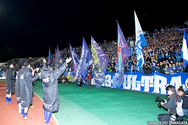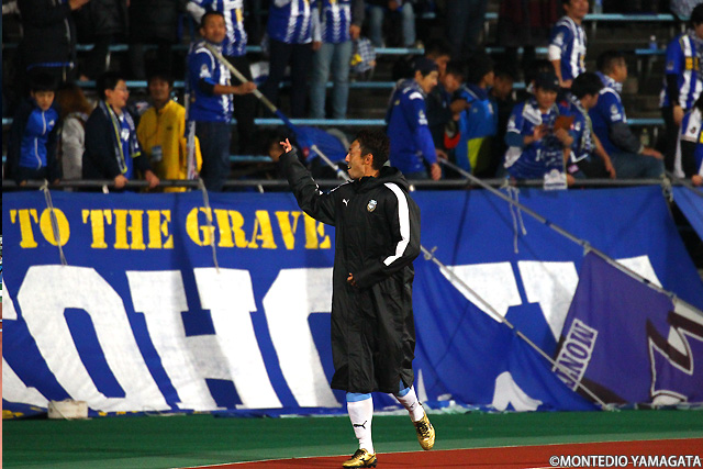 試合後、ゴール裏やメインスタンド前に挨拶に来てくれたのは昨年までモンテディオ山形に在籍していた鈴木雄斗選手。この試合では出場機会がありませんでしたが、J1連覇を目指すチームで活躍している鈴木選手に、モンテディオ山形サポーターからも大きな声が掛かっていました。