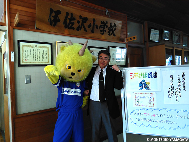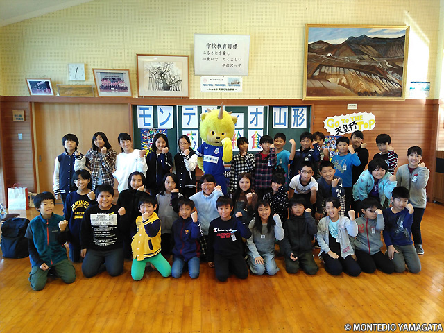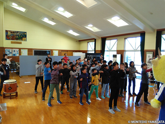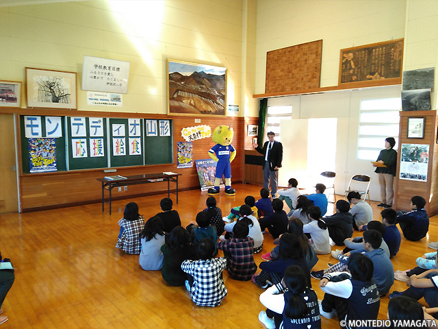 この日の授業は3年生から6年生までの33名が授業に参加、校舎の玄関や控室、教室、廊下にもモンテディオ山形のポスターや新聞記事が貼っていて、全校あげて応援頂いていることに感動しました。