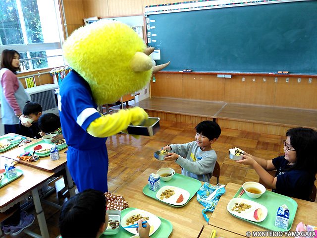 いつもの通り、ディーオはサポートを行いながら食育授業は進んでいきます。長井市の伝統野菜として「馬のかみしめ」という豆があり、いただいた給食にも入っていました。
