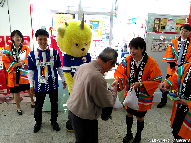 ご来局者の皆様に、郵便局から記念品の「カレー用お野菜セット」とモンテディオ山形からは山形市コラボステッカーが贈られました。