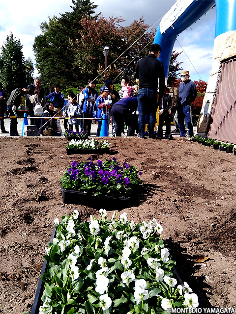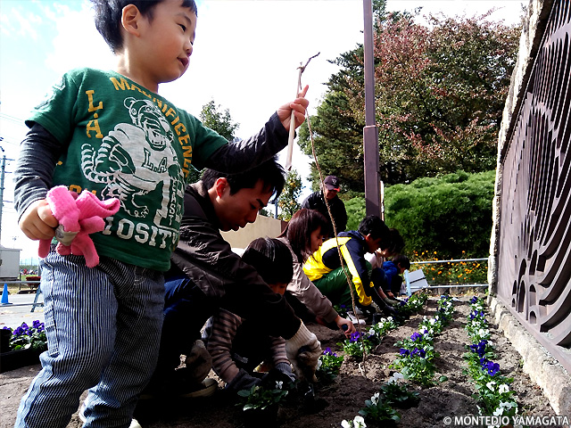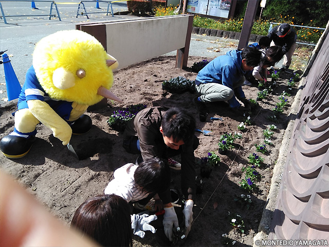 初めに、出羽園様より植え方の説明を受け、この日植えたのは県内で栽培された花苗(ビオラ)ですが、寒さにも強い山形県に最適な花だそうです。