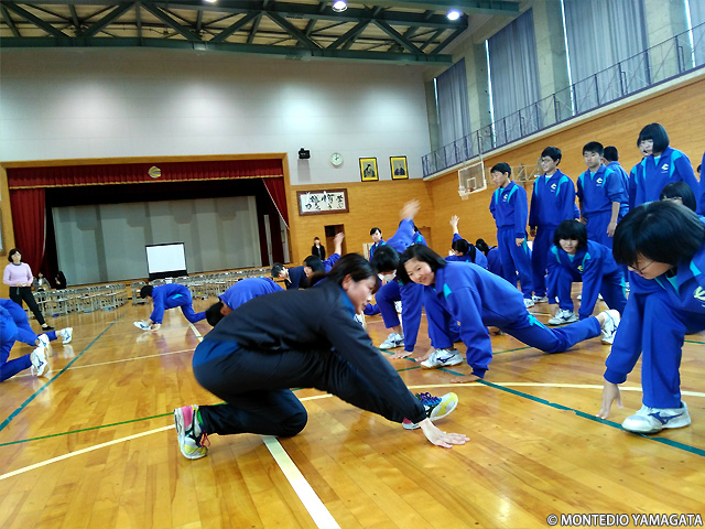 スポーツ山形21の齊藤梓が実技講師としてダイナミックストレッチを指導しました。