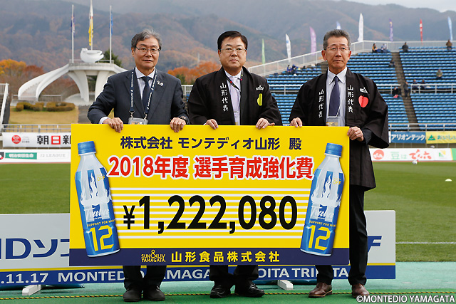 リーグ戦最終節ということもあり、シーズンを締めくくる様々なイベントが行われます。モンテディオ山形サポート飲料「12(トゥエルブ)」でお馴染みの山形食品様からは強化支援金の贈呈を頂きます。