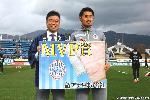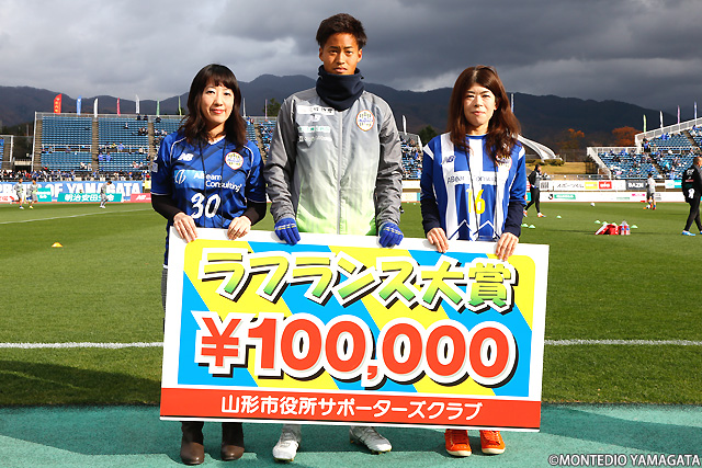 山形市役所サポーターズクラブより贈られるシーズン下半期の最優秀選手のラフランス大賞にはJ2リーグ戦12ゴールでチーム内得点王の小林成豪選手が選ばれます。小林選手は高いテクニックを活かしたチャンスメイクだけでなく、ゴール前での決定力も見せました。