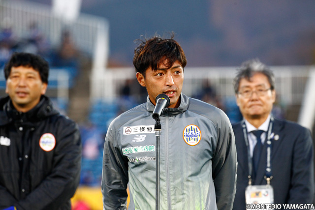 試合終了後シーズン終了セレモニーが行われます。代表取締役社長の森谷俊雄、木山隆之監督、山田拓巳キャプテンより、今シーズンの皆様からの熱いご声援への感謝の言葉を述べさせて頂きました。
