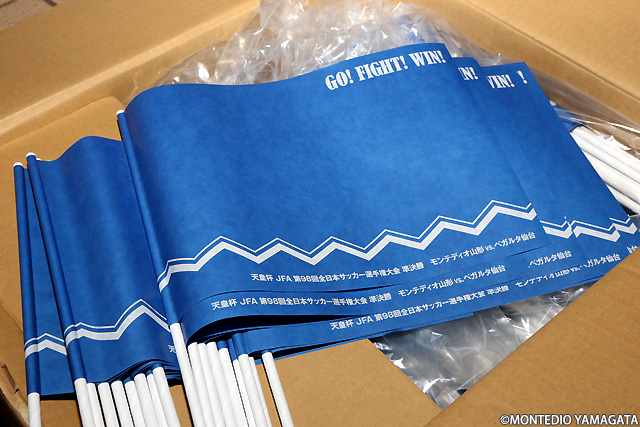 いよいよ選手入場。モンテディオ山形側のゴール裏スタンドにはビッグフラッグと大きな「山形」の文字が示されます。