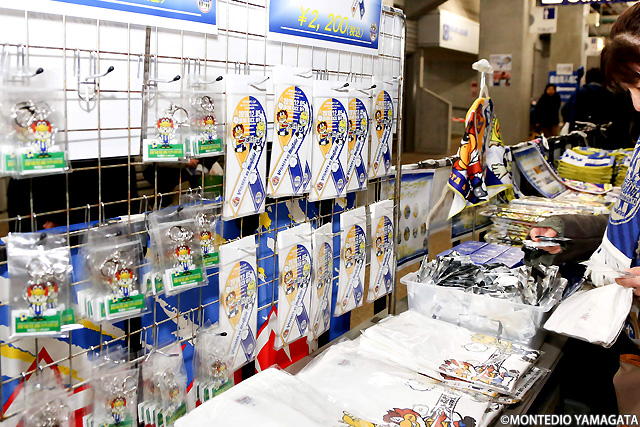 スタジアムの一角にはモンテディオ山形グッズコーナーも開設。この試合に合わせたベガルタ仙台とのコラボグッズも販売されました。