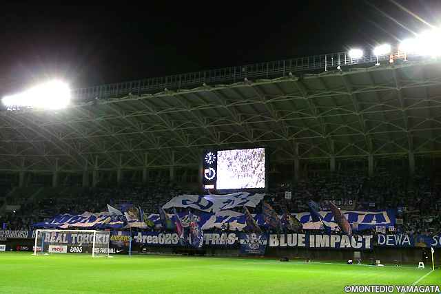 ウォーミングアップ前にはモンテディオ山形サイドのゴール裏スタンドは青一色に。