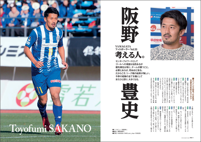 ロングインタビューは、山形のエースストライカー阪野豊史選手。移籍2年目となる今シーズンを公私ともに振り返ってもらいました。
