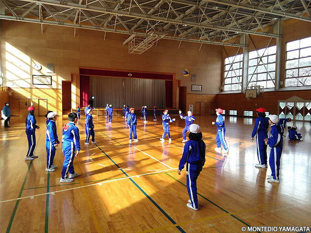見ると、受講してくれる東沢小学校の5年生が体育で元気いっぱいにソフトバレーをしていました。