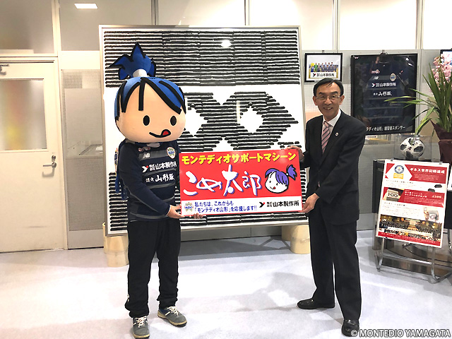 本日は、モンテディオ山形のトレーニングウェアスポンサー・正会員の株式会社山本製作所様より、コイン精米機こめ太郎の支援金150,000円を頂戴いたしました。