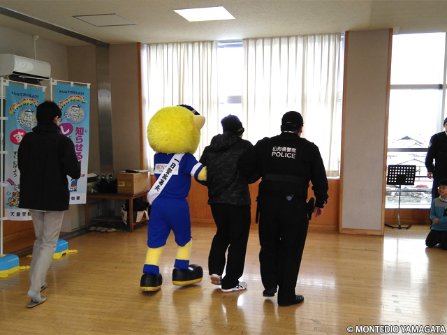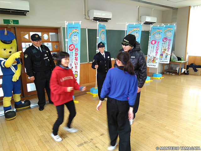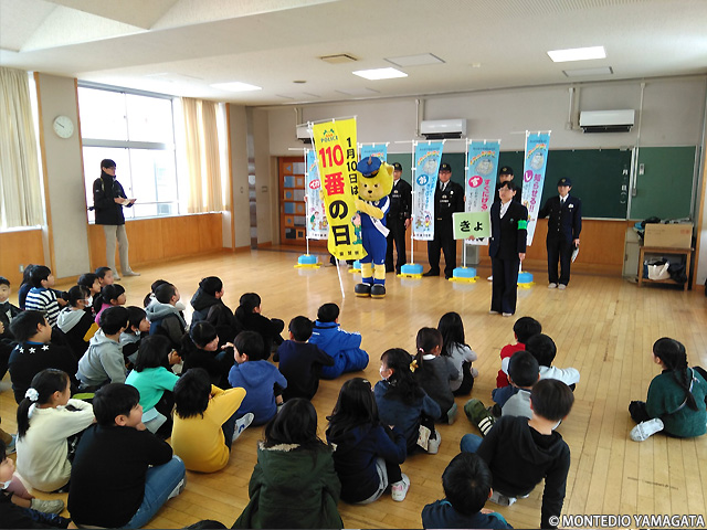 天童市立中部小学校へ移動し110番教室の寸劇にディーオも参加。