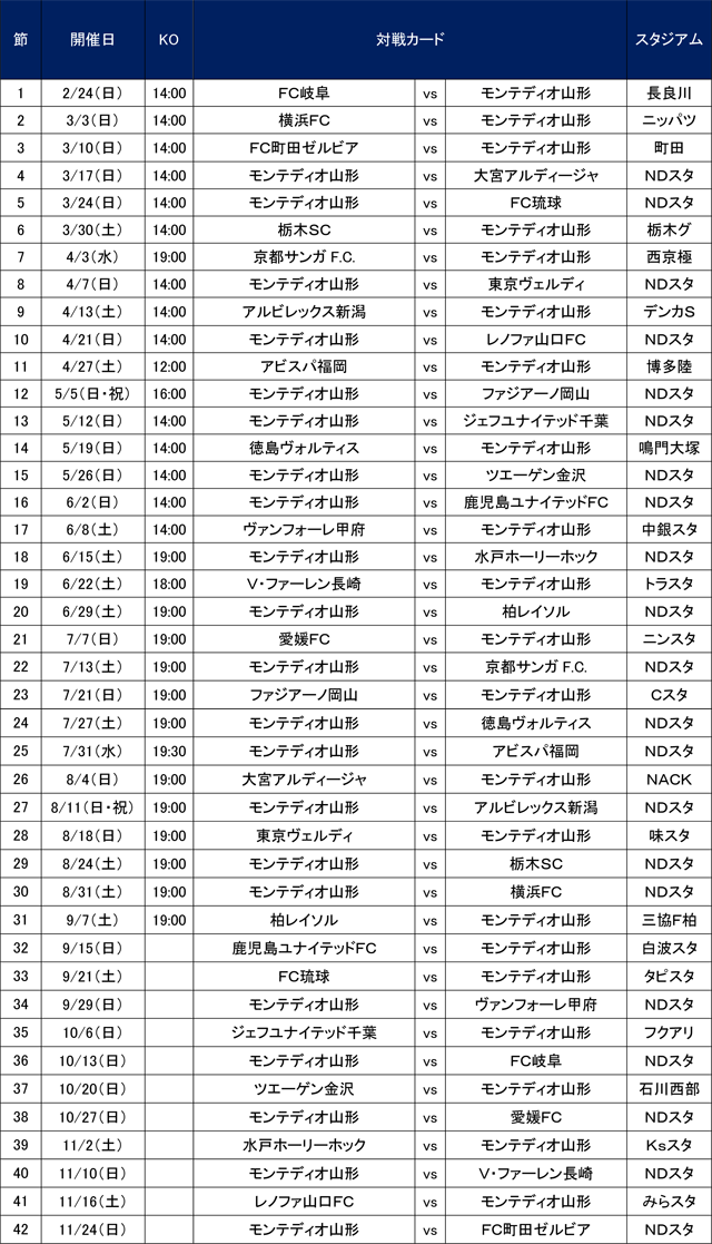 公開日 2019.01.23 2019明治安田生命J2リーグ試合スケジュールについて 2019明治安田生命J2リーグ モンテディオ山形のゲームスケジュールを次のとおりお知らせします。 ※今後、変更になる可能性があります。追加情報につきましては随時発表いたします。※第31節は2019JリーグYBCルヴァンカップにおいて柏レイソルがプライムステージに進出した場合、開催日が9月18日(水)に変更となる可能性があります。 #チーム ニュース一覧