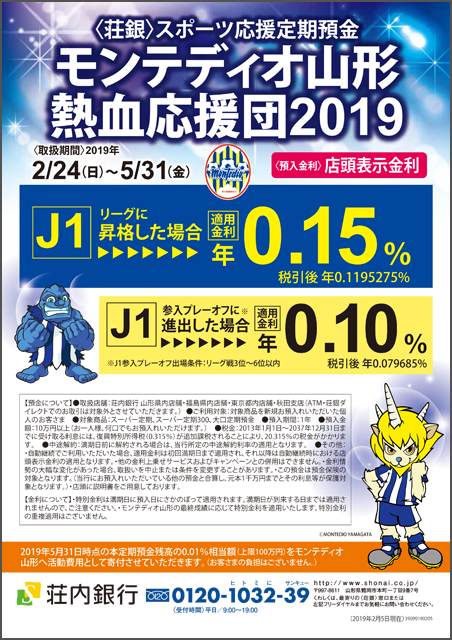 弊社スポンサー・正会員の株式会社荘内銀行様より、『<荘銀>スポーツ応援定期預金「モンテディオ山形熱血応援団2019」』が2019年2月24日(日)より取扱開始となりますのでお知らせします。2019年5月31日(金)時点の本定期預金残高の0.01%相当額(上限100万円)が、モンテディオ山形の活動費用として弊クラブへ寄付されます。