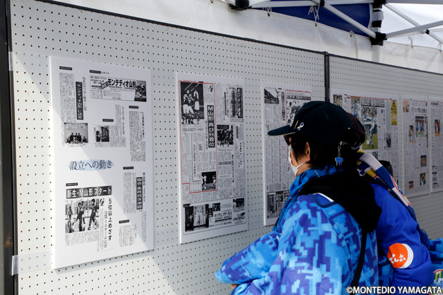 モンテディオ山形としての活動を地元メディアとして長年熱くサポート頂いている山形新聞社様が、この試合と次節FC琉球戦を「山形新聞 開幕シリーズ」と銘打ち、紙面やスタジアムイベントでホーム開幕を盛り上げて頂きました。特設ブースでは、懐かしさと熱い想いが蘇る記事の数々が展示され、皆さん熱心にご覧になっていました。