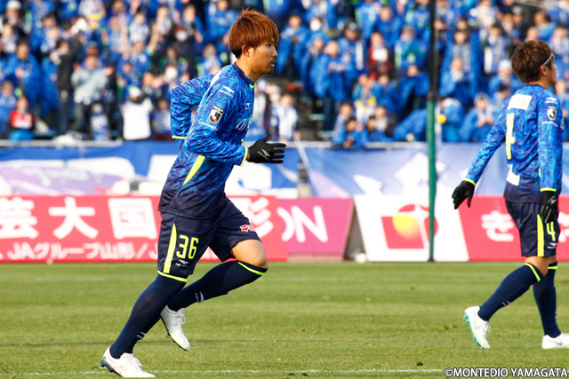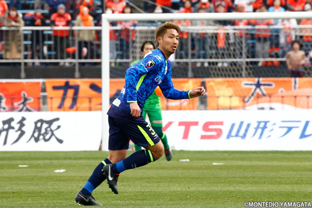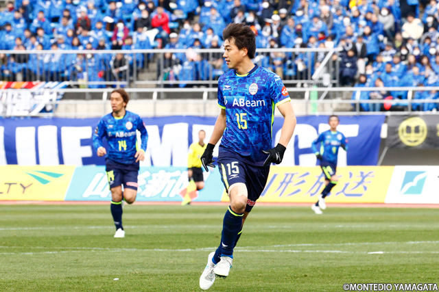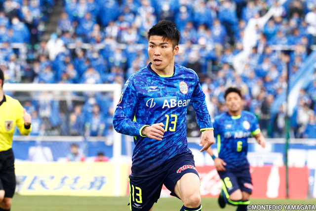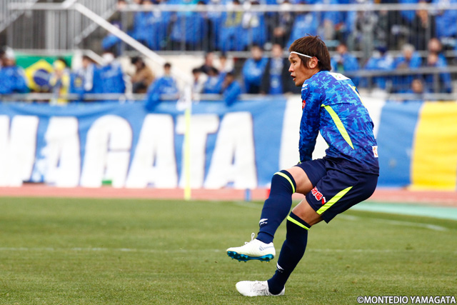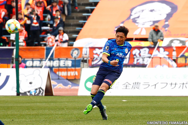 開幕からのアウェイ3連戦では、正確な右足のキックでセットプレーやクロスからモンテディオ山形のゴールを演出した三鬼海選手。この試合でも鋭いボールをゴール前に送ります。