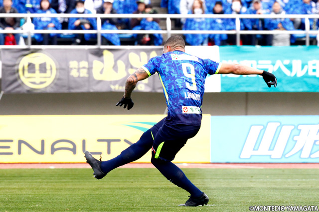 前半20分、自ら倒されて得たPKを蹴りゴールを決めるジェフェルソン バイアーノ選手。モンテディオ山形の選手としてはNDスタ初見参となったバイアーノ選手は、パワフルな体躯を活かし相手ディフェンダーを弾き飛ばすようなドリブルを見せ、ホームのサポーターに強烈な印象を残します。