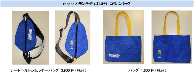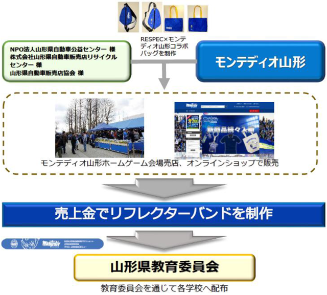 NPO法人山形県自動車公益センター様、株式会社山形県自動車販売リサイクルセンター様、山形県自動車販売店協会様と弊クラブモンテディオ山形が連携し、respecブランドでバッグを製作。スタジアムなどで販売し、このコラボバッグの売上金で山形県内の新小学一年生全員にモンテディオ山形オリジナル交通安全リフレクターバンドをプレゼントいたします。地域の未来を担う子どもたちへ交通安全意識の醸成、そして山形県のものづくりの品質の高さを広く伝えていくと共に、これからの時代を担う子どもたちへリサイクルの重要性を伝えていきます。