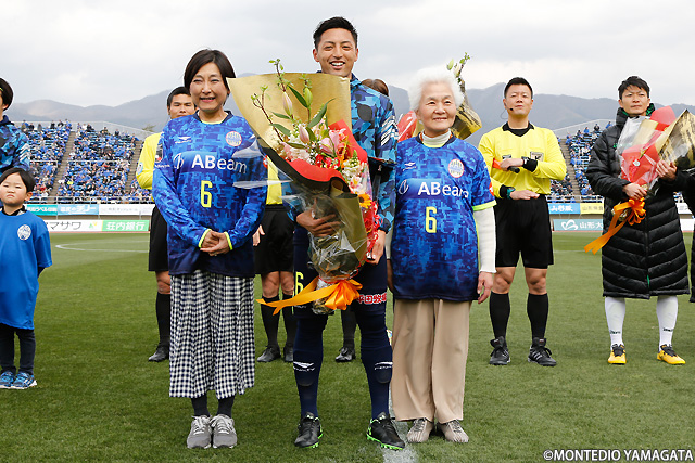 その山田拓巳選手に、Jリーグ通算200試合出場の表彰が行われます。市立船橋高校からモンテディオ山形に加入し、以後12シーズンに渡ってモンテディオ一筋でプレーし200試合と言う数字を積み上げた山田拓巳選手へは、スタンドからも大きな拍手が送られました。