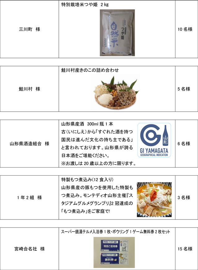 モンテディオ山形の勝利に貢献した選手が表彰されます。また、「おいしい山形サポーター賞」として、ご来場いただいたお客様も試合当日、入場ゲートでお配りしているマッチデープログラムにスタンプがあれば見事、大当たり!当選された方は総合案内にお越しください。 ※賞品は後日郵送となります。