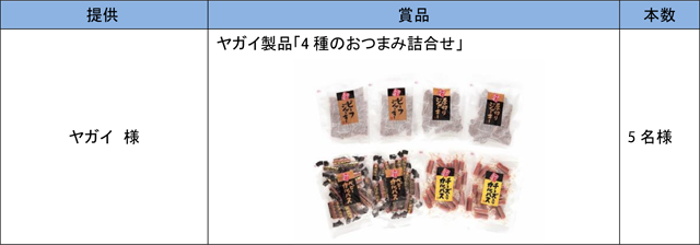 抽選くじは、ヤガイの大人気商品「おやつカルパス」と、新商品の「カレーおやつカルパス」です。くじもぜひお召し上がりください!