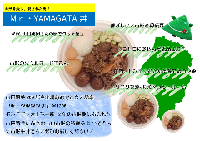 山田選手200試合出場おめでとう!記念、モンテディオ山形一筋12年の山形愛にあふれた山田選手にふさわしい山形の特産品6つで作った山形牛丼です!