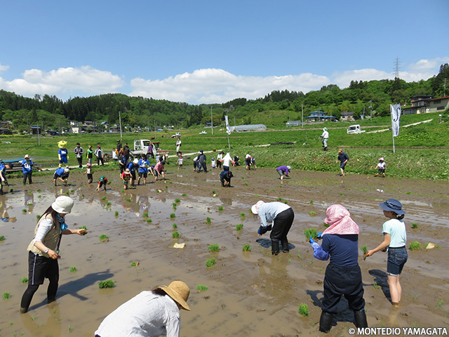 今年で米作りは9年目、「山響棚田米」の田植えも同時に行われ、山形交響楽団の皆様も参加、サポーターの皆様にもたくさんお越しいただき、賑やかな雰囲気で順調に田植えが進んでいきました。