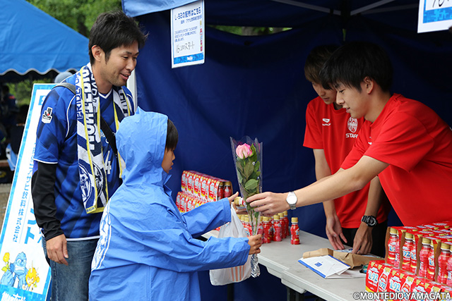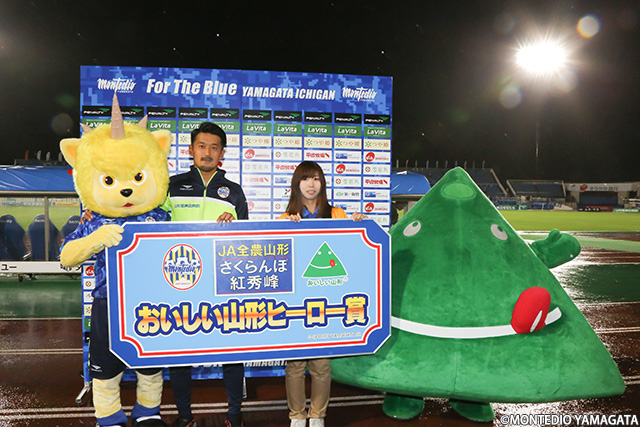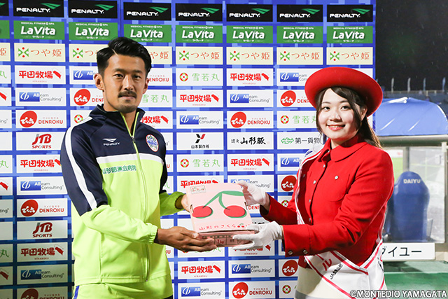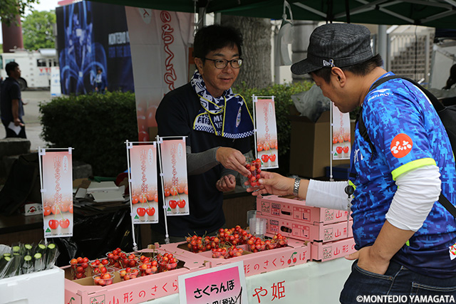 この試合はJA全農山形様による「JA全農山形さくらんぼサンクスマッチ」として開催。この時期の山形の季節を象徴するさくらんぼをはじめ、山形の食の代名詞・山形牛のステーキの販売もあり、首位攻防戦に向けて気合の入ったサポーターに、さらにより大きなパワーをチャージしていました。