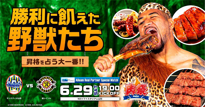 2019年6月29日(土)に開催の柏レイソル戦において、ブルーキッチングルメ企画【肉祭】を開催いたします。暑い夏へ向かうこの時期に、各売店による【肉】にちなんだメニューをご賞味いただき、食べ歩き企画で豪華商品を当ててください!スタミナをつけてモンテディオ山形への応援をお願いします。
