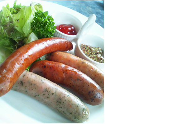 ◎自家製フランク4種盛り(韋駄天、県産豚/ハーブ、ガーチック、チーズ):700円