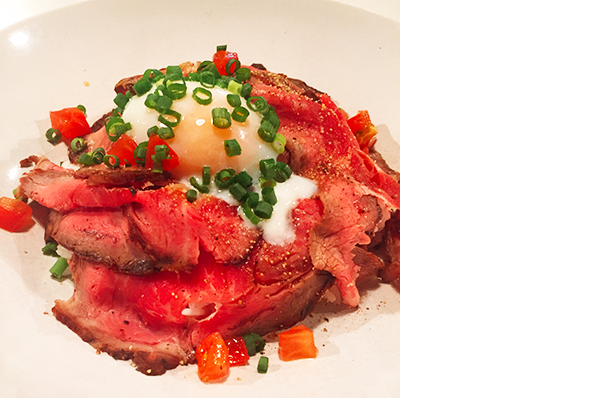 柔らかく、ジューシーなローストビーフを山形県産はえぬきご飯の上に贅沢に盛り付けました。自家製の甘辛タレと温玉、にんにくが相性抜群!一度食べたら箸が止まりません。