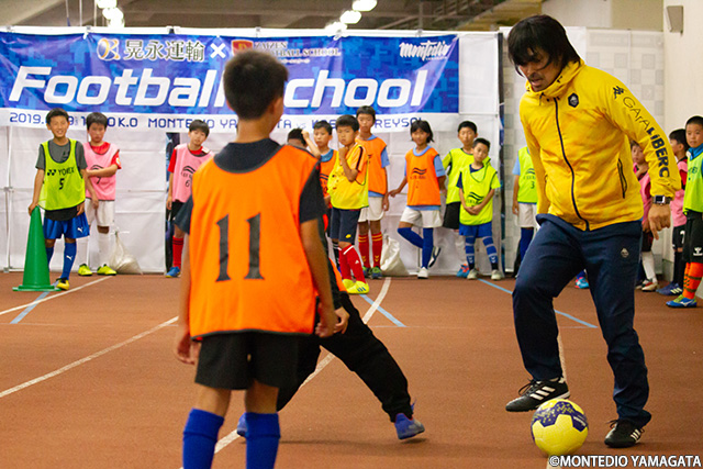 試合前の屋内走路では晃永運輸株式会社協賛 財前宣之フットボールクラブサッカースクールが開催されました。生憎の雨のため屋内での開催となりましたが、子どもたちは財前コーチと一緒に、楽しく真剣にボールを追いかけていました。