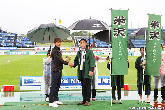 この試合は山形市、東根市、河北町、米沢市の市町村応援デーでした。各市町からたくさんの方にご来場頂いた他、チームへの贈呈品も様々頂戴しました。米沢市からは米沢牛ビーフカレーの贈呈を、