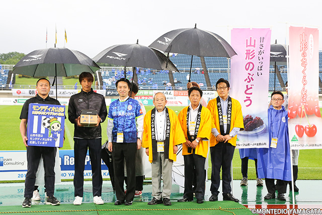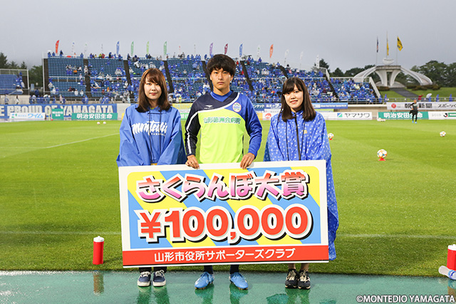さらに坂元達裕選手にはもう一つの表彰が。山形市役所サポーターズクラブの皆さんが選ぶ前半戦MVP・さくらんぼ大賞です。ここまで首位を行くチームの中で、ルーキーとは思えない活躍を見せてくれました。