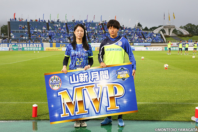 ピッチ内ウォーミングアップ前、5月の山新月間MVP賞の表彰が行われました。選ばれたのは、5月に開催された全4試合に出場し1ゴールを決め、キレのあるドリブルで攻撃を牽引した坂元達裕選手です。