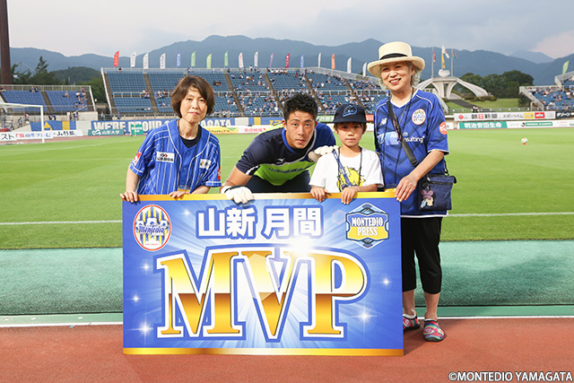 ピッチ内ウォーミングアップ前、6月の「山新月間MVP」の表彰が行われました。選出されたのは、J2リーグ戦全試合フル出場となっている守護神・櫛引政敏選手です。鋭い反応を活かしたセーブと安定感のあるプレーでチームを支えました。
