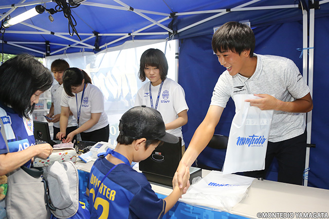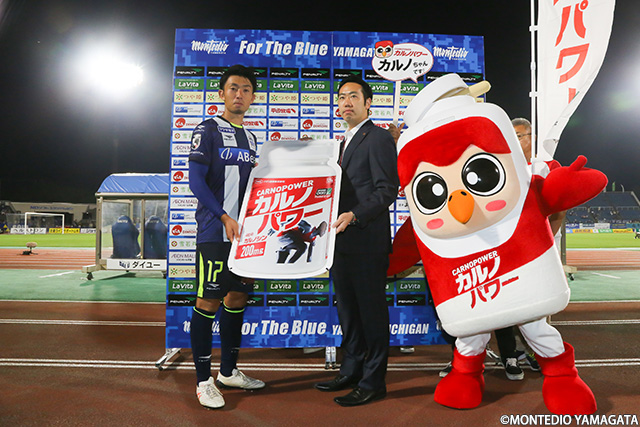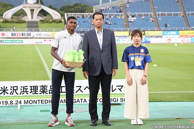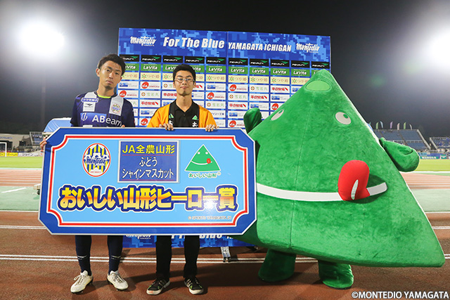 この試合は高畠町・庄内町の市町村応援デーとして開催。たくさんの町民の方にご来場頂いた他、高畠町からはぶどうを、庄内町からはハナブサ醤油ギフトの贈呈を頂きました。皆さまには常日頃から大きなご支援を頂いておりますが、改めて御礼申し上げます。