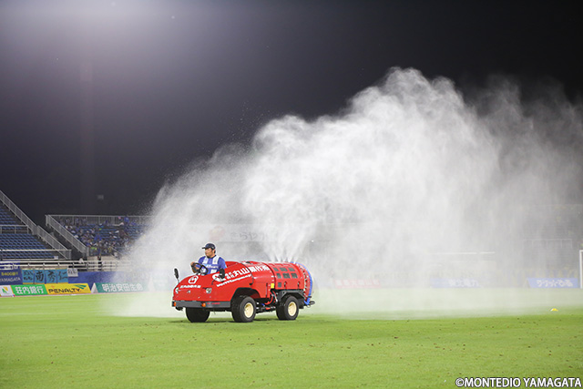 試合直前、ピッチに散水するステレオスプレイヤー。株式会社丸山製作所様からご提供頂いたものですが、その迫力にスタンドの皆さんの大きな注目を浴びていました。