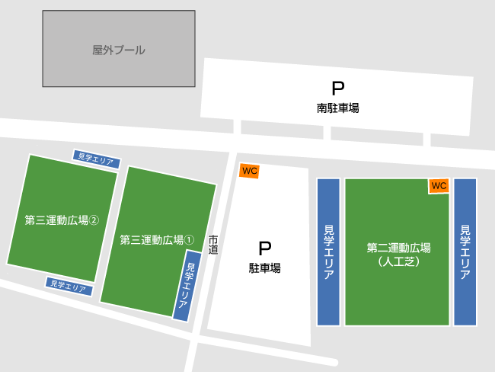 - 第二運動広場(人工芝グラウンド)及び第三運動広場での見学はフェンス外側にてお願い致します。また第三運動広場の見学エリアは市道に隣接しております。車両には十分ご注意いただき、道路に広がっての見学はご遠慮ください。