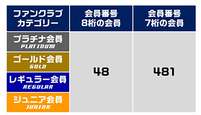 例:ファンクラブ・ゴールドで会員番号が「5123456」の会員 ⇒「4815123456」